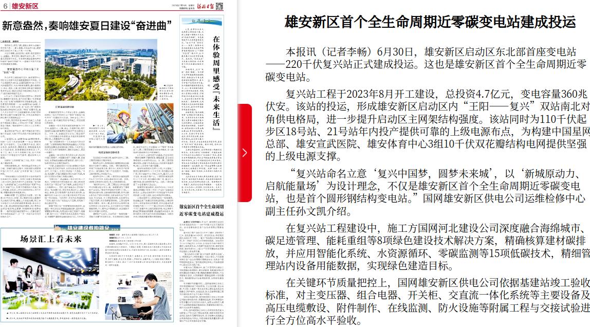 河北日报:雄安新区首个全生命周期近零碳变电站建成投运