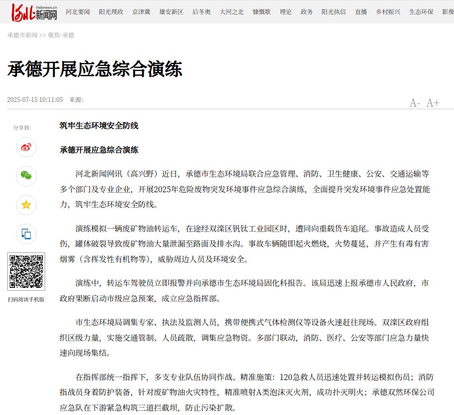 河北新闻网讯(高兴野)近日,承德市生态环境局联合应急管理、消防、卫生健康、公安、交通运输等多个部门及专业企业,开展2025年危险废物突发环境事件应急综合演练,全面提升突发环境事件应急处置能力,筑牢生态环境安全防线。
