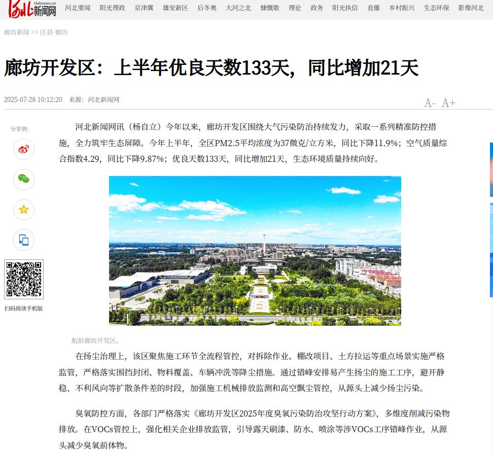 河北新闻网:廊坊开发区:上半年优良天数133天,同比增加21天