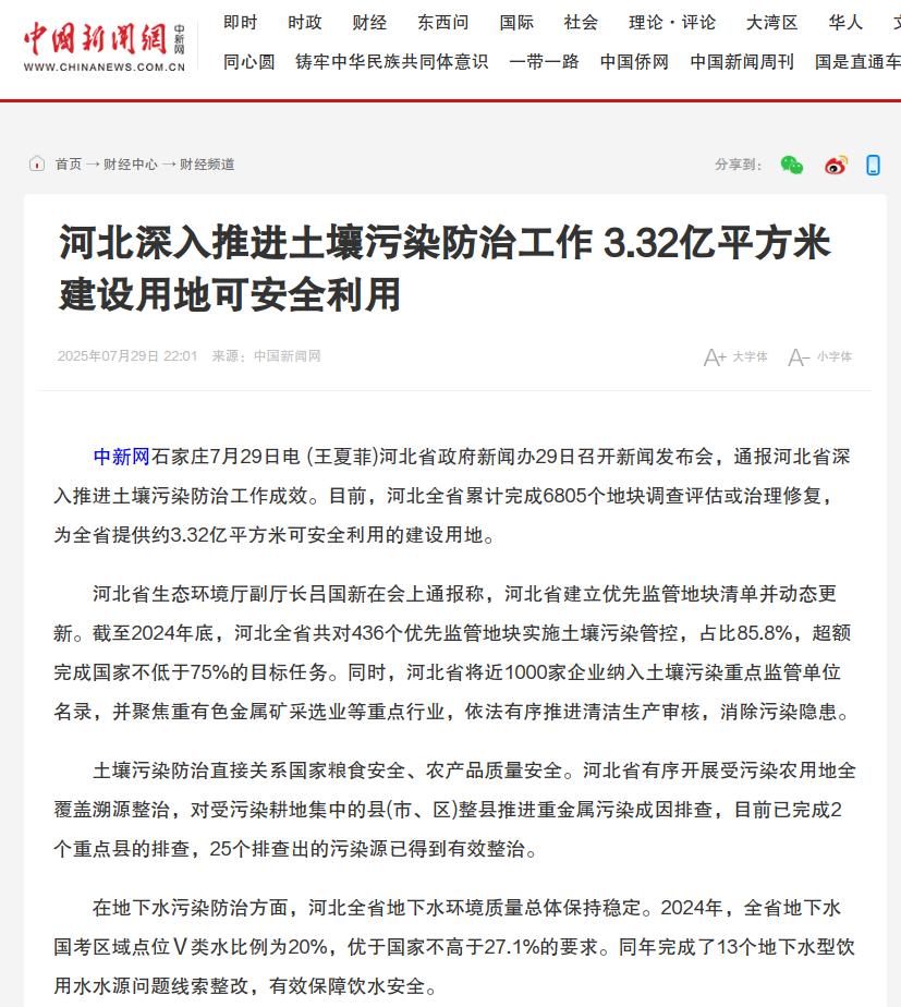 中新网:河北深入推进土壤污染防治工作 3.32亿平方米建设用地可安全利用