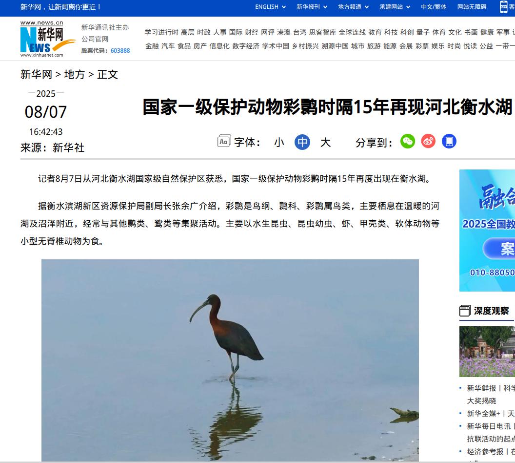 新华网:国家一级保护动物彩鹮时隔15年再现河北衡水湖