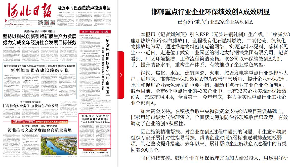 河北日报:邯郸重点行业企业环保绩效创A成效明显 已有6个重点行业32家企业实现创A