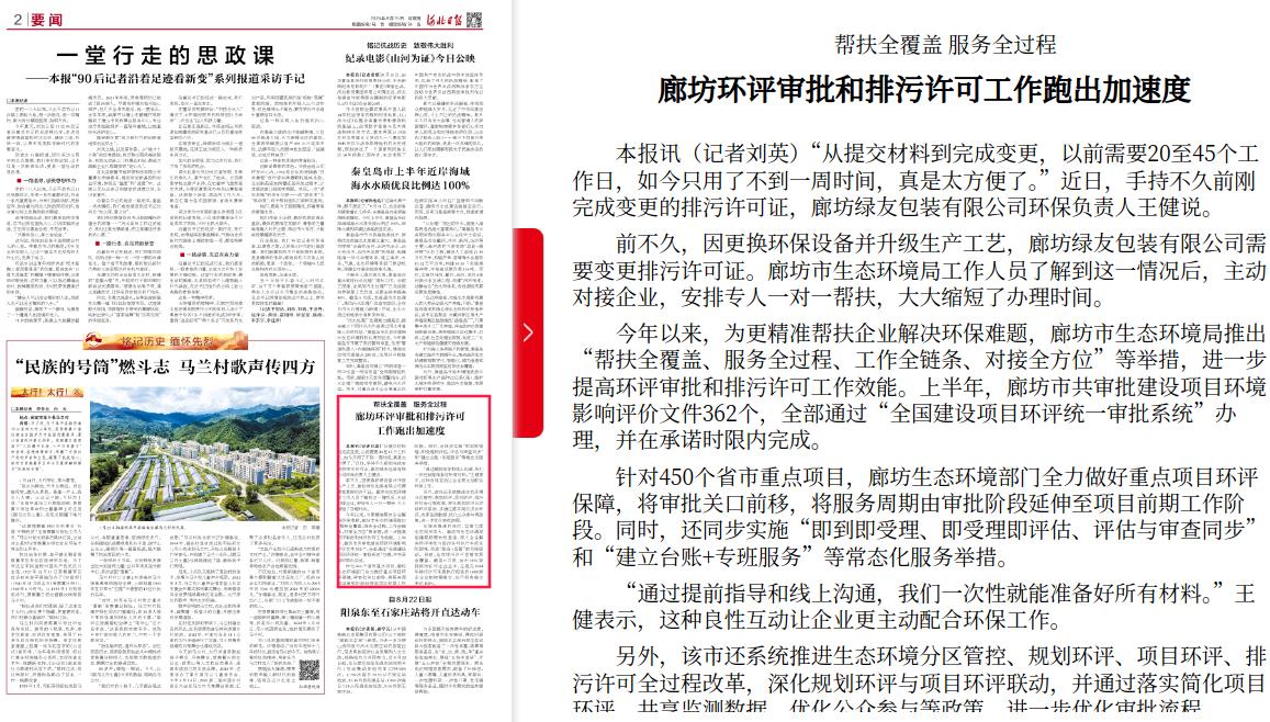 河北日报:帮扶全覆盖 服务全过程 廊坊环评审批和排污许可工作跑出加速度