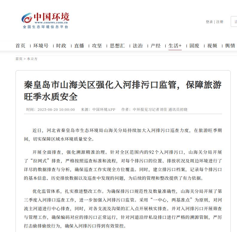 中国环境客户端:秦皇岛市山海关区强化入河排污口监管,保障旅游旺季水质安全