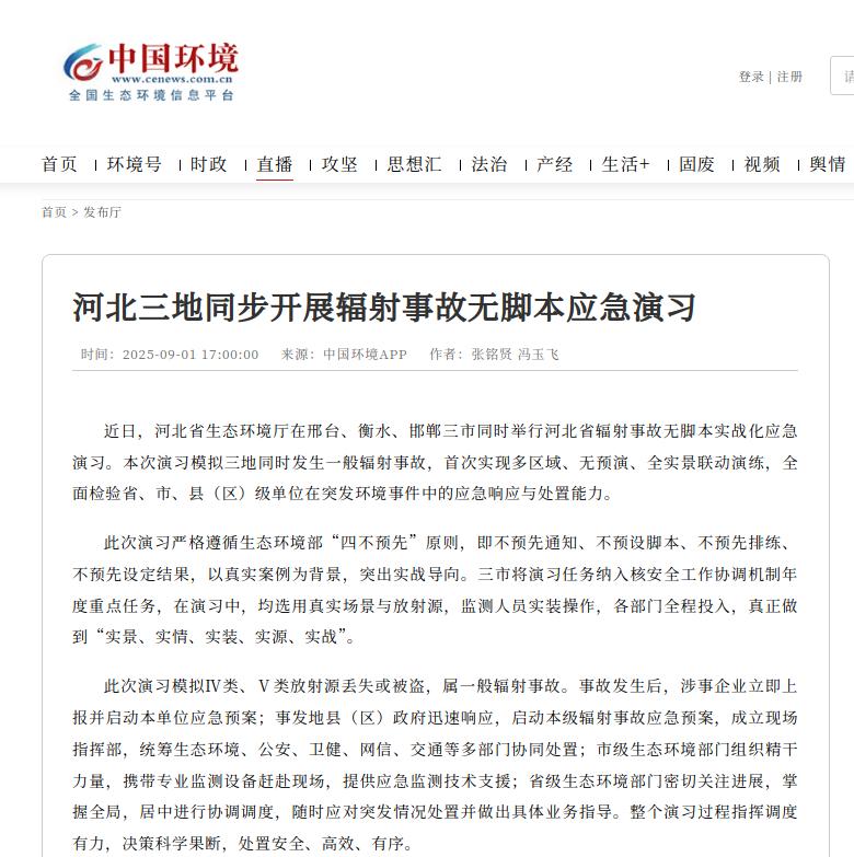 中国环境客户端:河北三地同步开展辐射事故无脚本应急演习