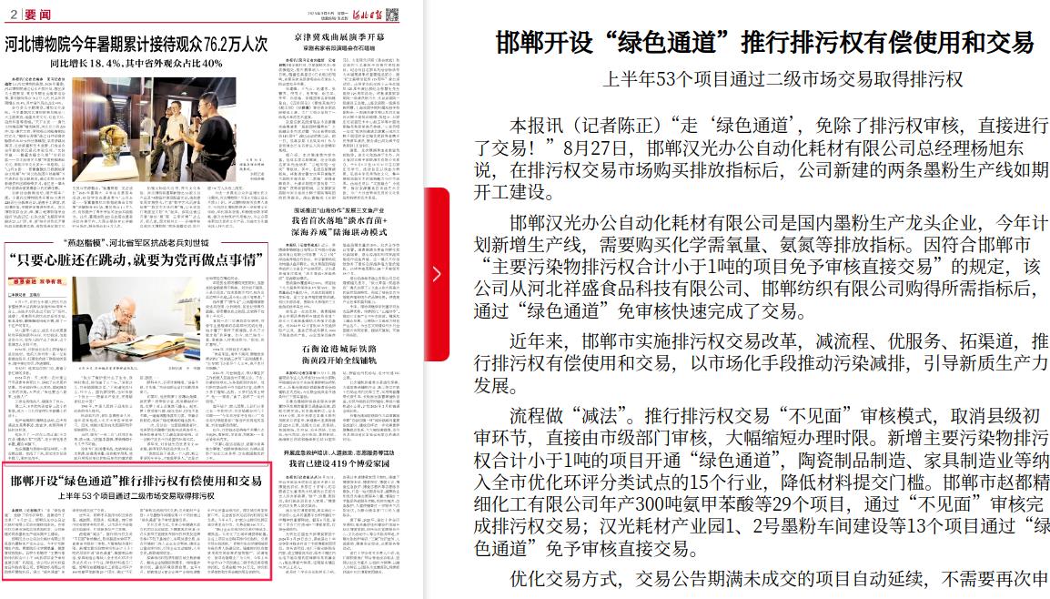 河北日报:邯郸开设“绿色通道”推行排污权有偿使用和交易 上半年53个项目通过二级市场交易取得排污权