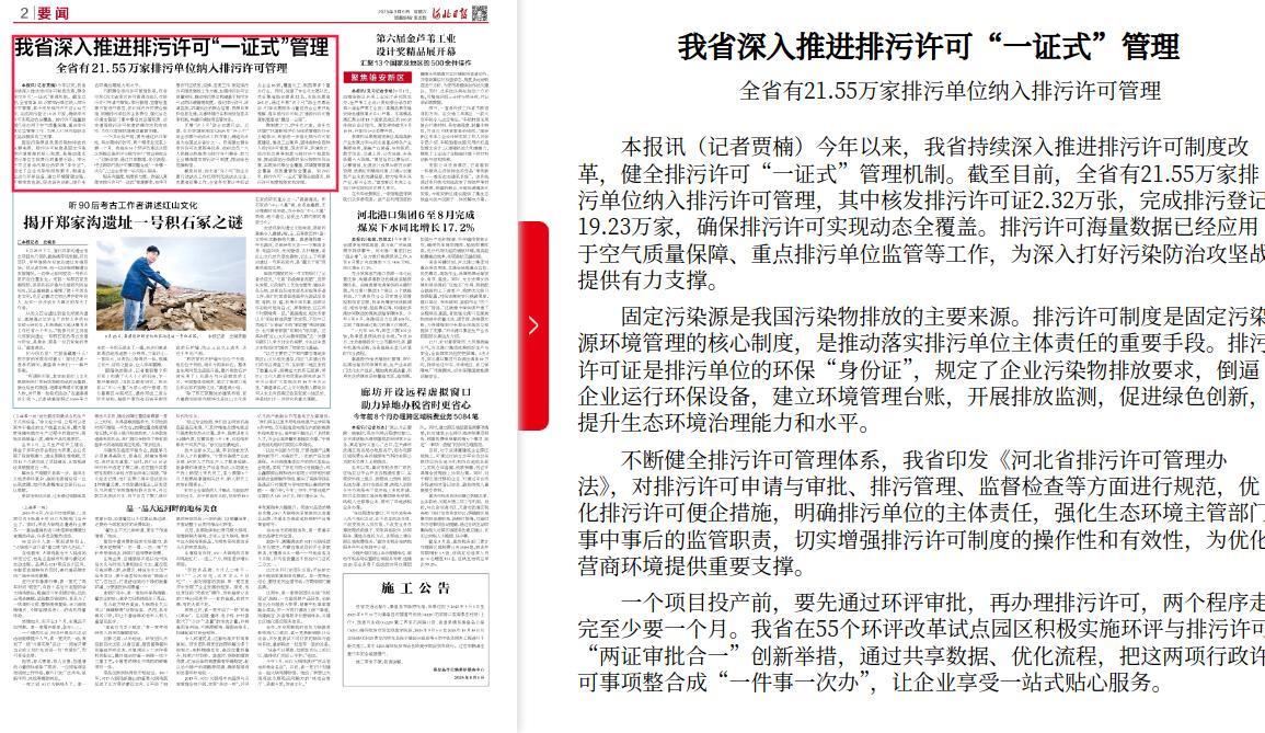 河北日报:我省深入推进排污许可“一证式”管理 全省有21.55万家排污单位纳入排污许可管理