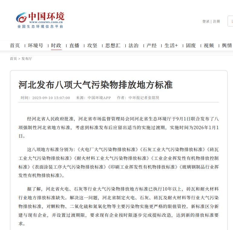 中国环境客户端:河北发布八项大气污染物排放地方标准