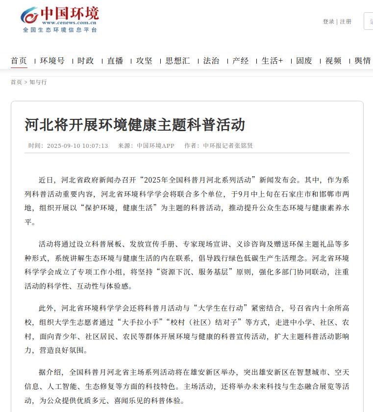 近日,河北省政府新闻办召开“2025年全国科普月河北系列活动”新闻发布会。其中,作为系列科普活动重要内容,河北省环境科学学会将联合多个单位,于9月中上旬在石家庄市和邯郸市两地,组织开展以“保护环境,健康生活”为主题的科普活动,推动提升公众生态环境与健康素养水平。