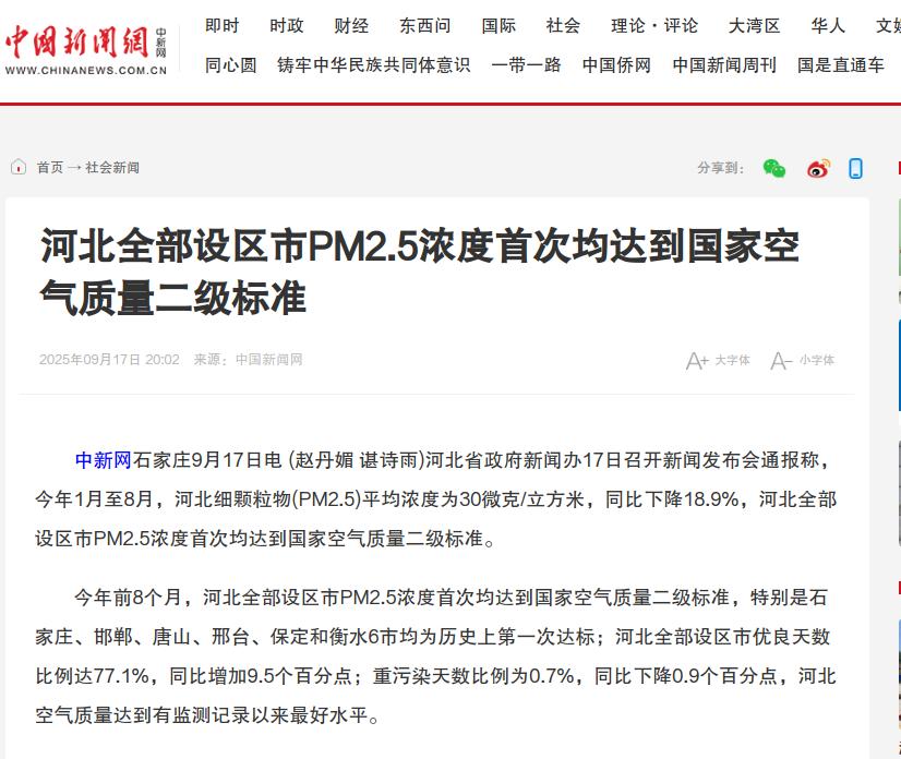 中新网:河北全部设区市PM2.5浓度首次均达到国家空气质量二级标准