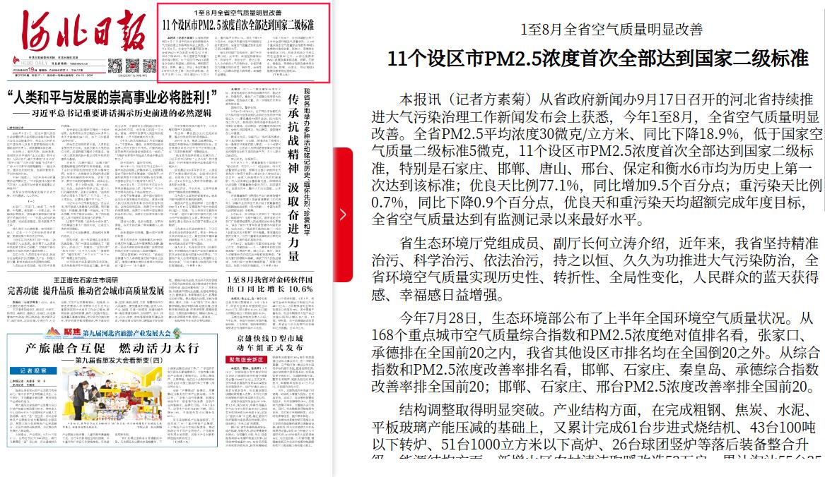 河北日报:1至8月全省空气质量明显改善 11个设区市PM2.5浓度首次全部达到国家二级标准