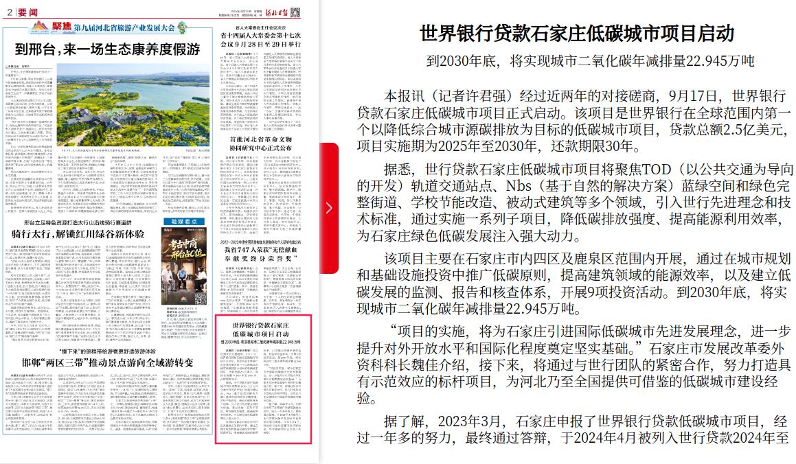 河北日报:世界银行贷款石家庄低碳城市项目启动 到2030年底,将实现城市二氧化碳年减排量22.945万吨