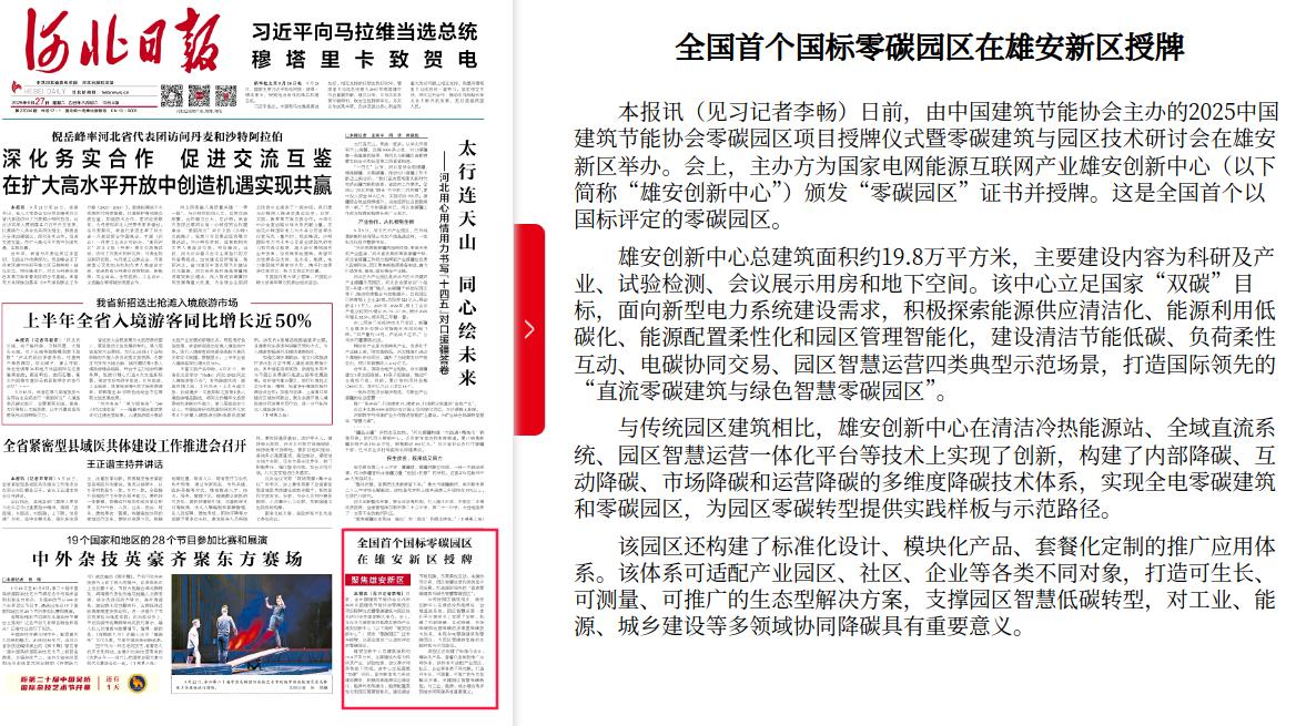 河北日报:全国首个国标零碳园区在雄安新区授牌