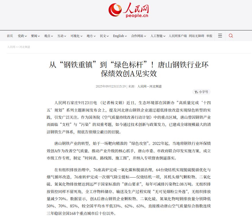 人民网:从“钢铁重镇”到“绿色标杆”!唐山钢铁行业环保绩效创A见实效