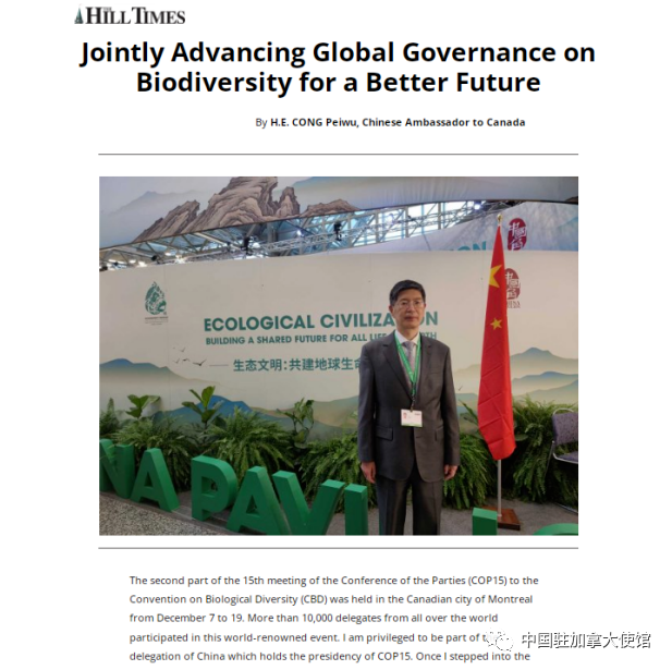 2022年12月21日,中国驻加拿大大使丛培武在加拿大主流媒体《国会山时报》发表题为《共同促进全球生物多样性治理迈向更好明天》的署名文章。全文如下: