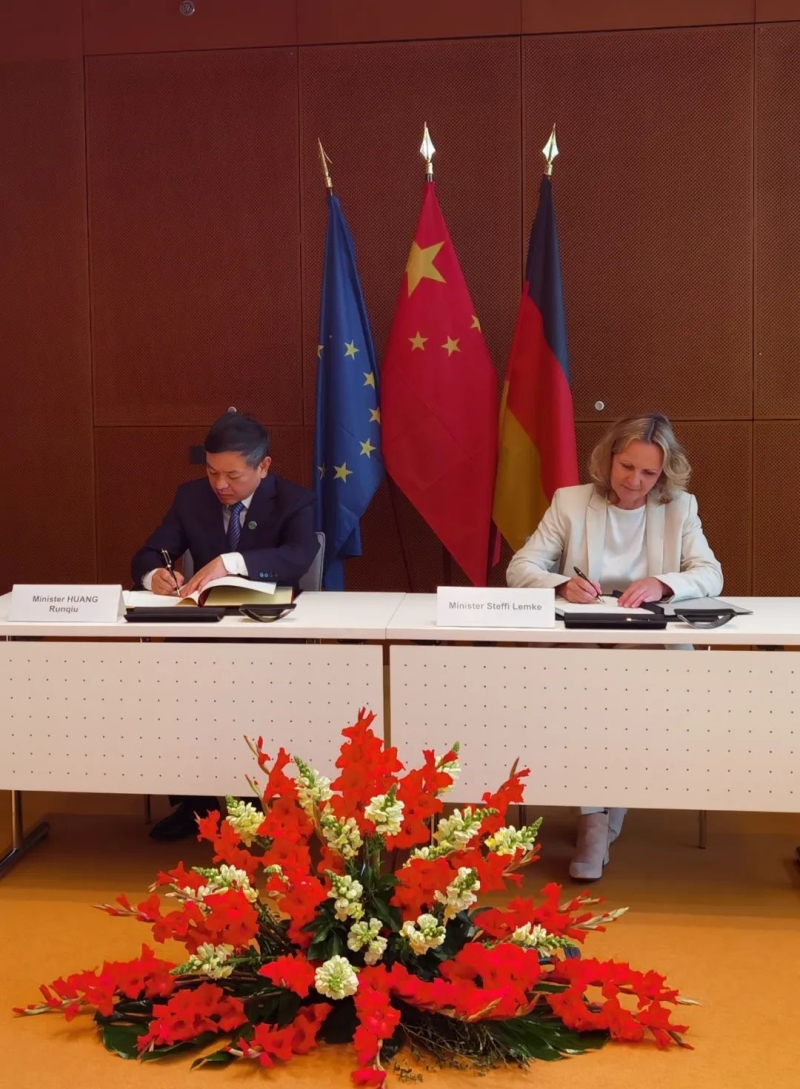 会谈期间,黄润秋与莱姆克签署了两国部门间《关于环境、气候变化和可持续发展领域合作的联合意向声明》。根据声明,双方重申全面落实《联合国气候变化框架公约》及其《巴黎协定》的目标承诺,表示将共同推进落实“昆明—蒙特利尔全球生物多样性框架”和应对海洋垃圾污染。双方还一致同意在环境保护、绿色金融、生物多样性保护和生态修复、塑料污染治理、化学品及固体废物管理等领域加强合作。