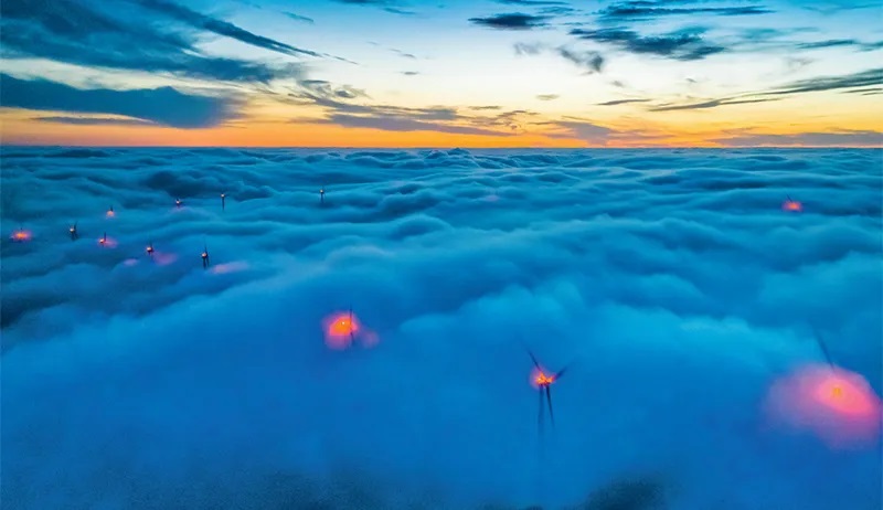 近年来,各地立足资源禀赋,加快清洁能源开发利用,推动发展方式绿色低碳转型。图为2023年2月23日晚,在湖北省宜昌市秭归县两河口镇云台荒村拍摄的风力发电机组(无人机照片)。 新华社发 郑家裕/摄