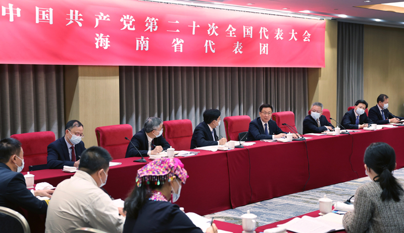 10月17日,韩正同志参加他所在的党的二十大海南代表团讨论。新华社记者 姚大伟 摄
