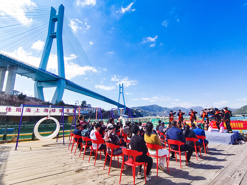 近日,在福建省宁德市福鼎市佳阳畲族乡的渔排上,身着畲族服饰的理论宣讲轻骑兵“山哈梦”小分队成员给渔民们宣讲党的二十大精神。宣讲员钟昌敢说:“党的二十大报告提出‘全面推进乡村振兴’‘坚持农业农村优先发展’‘加快建设农业强国’。我们一定要充分领会党的二十大精神,发挥闽东地区资源禀赋优势,念好‘山海经’,抓住机遇多抱几个‘金娃娃’!”