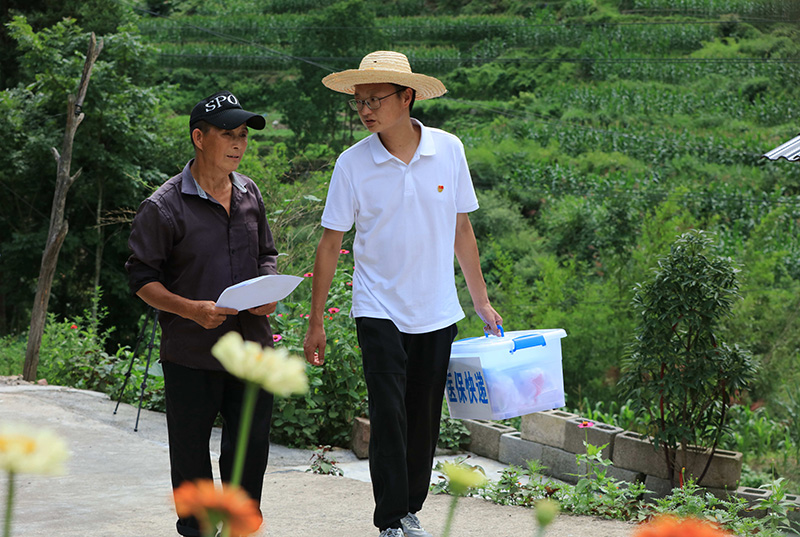 2022年7月5日,湖南省张家界市武陵源区天子山街道黄河村的“医保快递员”(右)在了解群众诉求。新华社发(吴勇兵 摄)