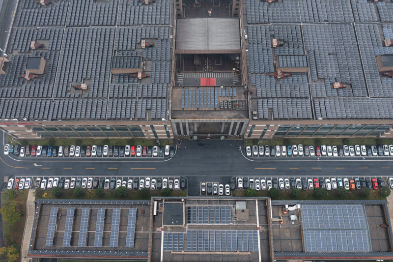 这是浙江省杭州市临安区金马工业园区内的一家“无废工厂”,屋顶上安装了光伏发电设备(2022年12月9日摄,无人机照片)。新华社记者 徐昱 摄