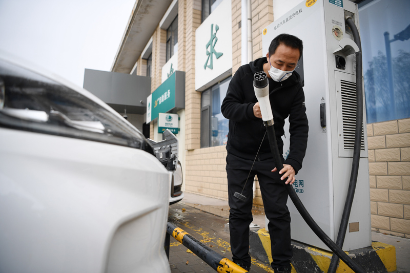 一名车主在国网宁夏电力石嘴山供电公司长胜供电所充电桩为车辆充电(2022年11月11日摄)。新华社记者 王鹏 摄