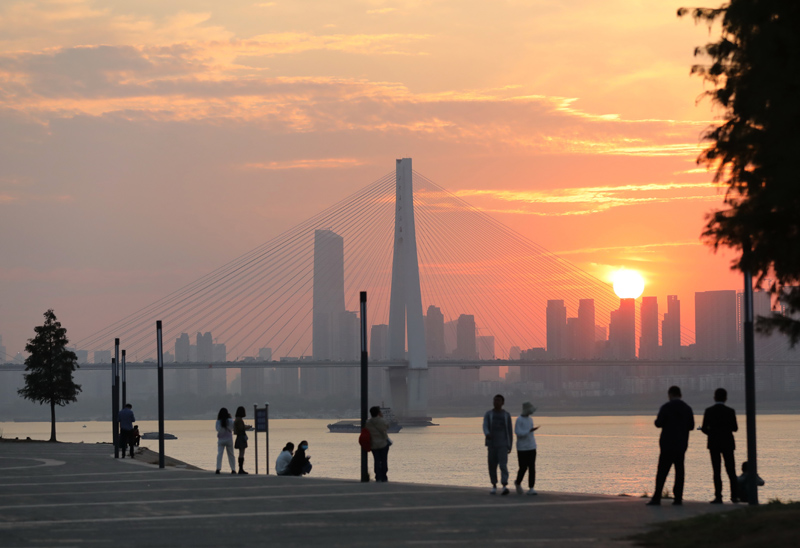 市民在湖北省武汉市青山江滩边欣赏落日(2022年11月8日摄)。新华社记者 姚琪琳 摄