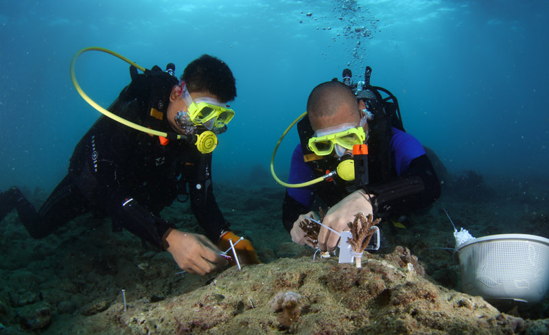 在海南省三亚市亚龙湾相关海域,潜水员在海底移植珊瑚(2022年11月17日摄)。新华社记者 杨冠宇 摄