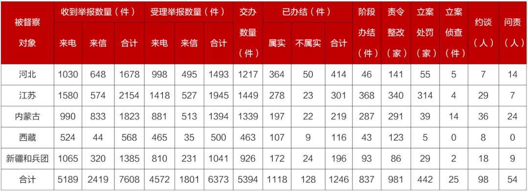 截至4月10日晚22:00,各督察组共收到群众来电、来信举报7608件,受理有效举报6373件,经梳理合并重复举报,累计向被督察对象转办5394件;被督察对象已办结或阶段办结2083件,其中立案处罚442家;立案侦查25件;约谈党政领导干部98人,问责党政领导干部54人。