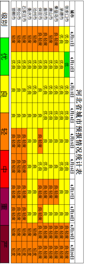 经河北省生态环境应急与重污染天气预警中心与中国环境监测总站和省环境气象中心联合会商,预计2022年4月中旬(11日~20日),11日,午后温度达30℃左右,前期南北风辐合影响,污染汇聚,可能出现臭氧轻度污染;12日~14日,受可能的降水过程和较强北风影响,大气扩散条件有利,我省大部地区空气质量优良;15日~17日,我省受高压系统后部控制,山前城市风速相对较小,中南部部分城市出现轻度污染;18日~20日,地面逐步转南风,温度明显回升,我省大部以良至轻度污染为主。