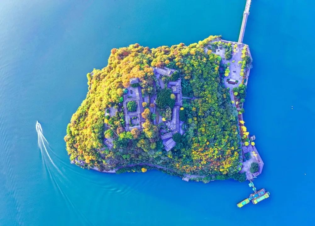 作品描述:2019年12月7日拍摄于重庆奉节县白帝城,鸟瞰重庆长江奉节段,实施长江保护以来水更绿,生态更优美。