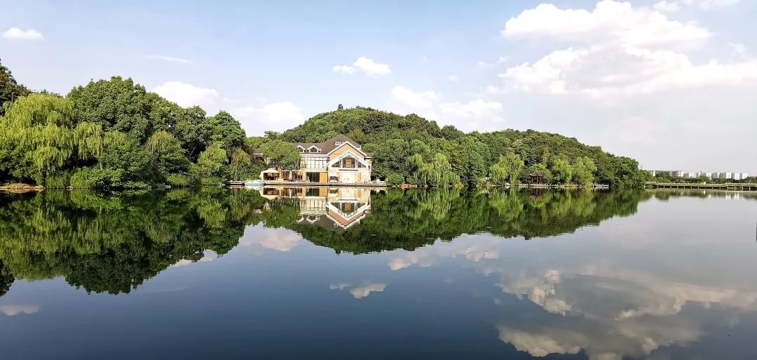 作品描述:杭州半山国家森林公园,蓝天、白云与绿水、青山相映成趣,构成一幅美丽的自然生态画卷。