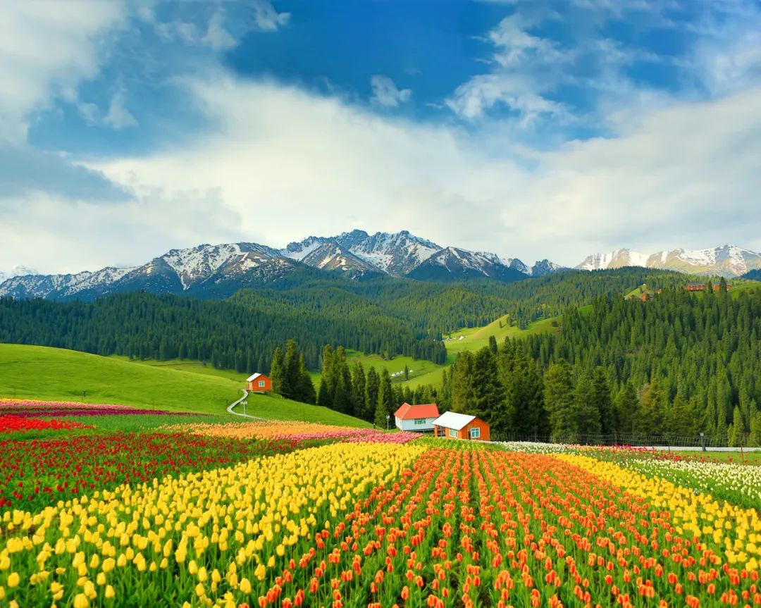 作品描述:新疆江布拉克景区种植的郁金香,将天山松林草原花海融为一体,新的天山景物吸引了国内外的游客。