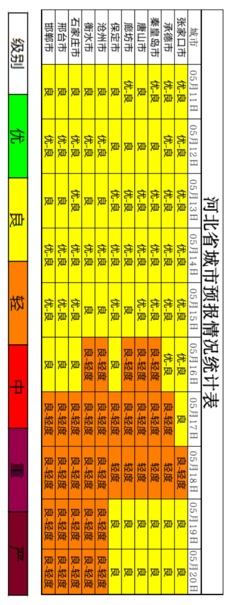 经河北省生态环境应急与重污染天气预警中心与中国环境监测总站、省气象灾害防御和环境气象中心联合会商,预计2022年5月中旬(11日~20日),前期受多股弱北风和间歇性降水过程影响,地面温度偏低,天空云量较多,大气扩散和湿清除条件总体有利,我省大部地区空气质量以优良为主;16日起,地面受低压影响,整体以南风为主,气温明显回升,辐射偏强,部分城市可能出现臭氧轻度污染过程。