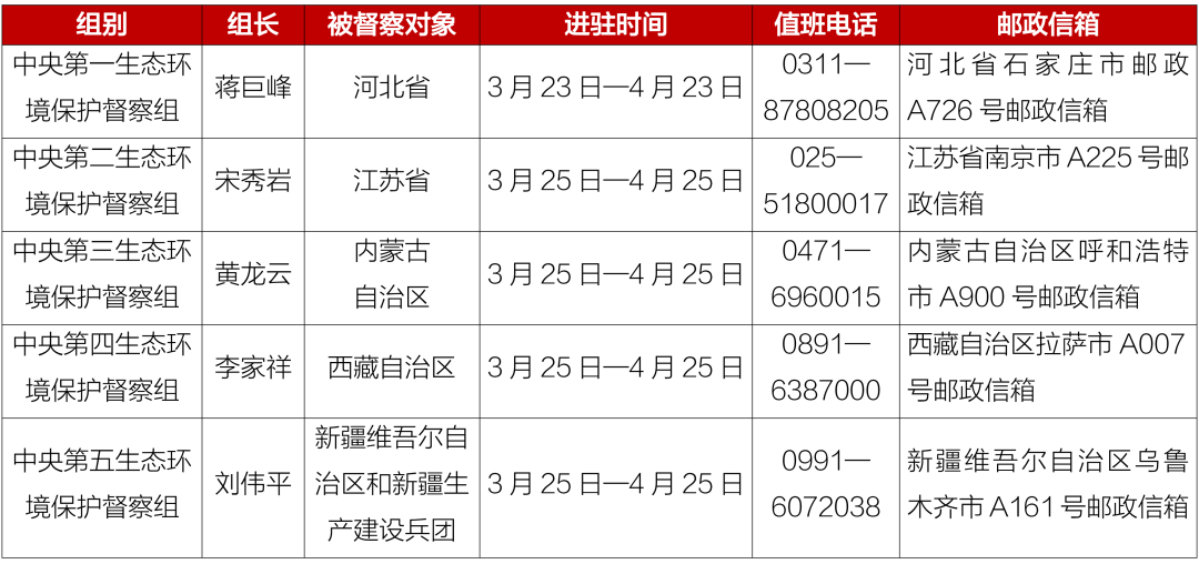 根据安排,第二轮第六批中央生态环境保护督察进驻时间1个月。进驻期间,各督察组分别设立专门值班电话和邮政信箱,受理被督察对象生态环境保护方面的来信来电举报,受理举报电话时间为每天8:00—20:00(其中西藏为每天9:00—21:00,新疆和兵团为每天10:00—22:00)。督察组全体成员将严格执行《中央生态环境保护督察纪律规定》和当地疫情防控相关要求,接受被督察对象和社会监督。在后续工作中,将严格落实中央有关要求,进一步为基层减负,简化程序、优化流程,不断提高督察工作的精准性、针对性,确保有序有效完成督察任务。