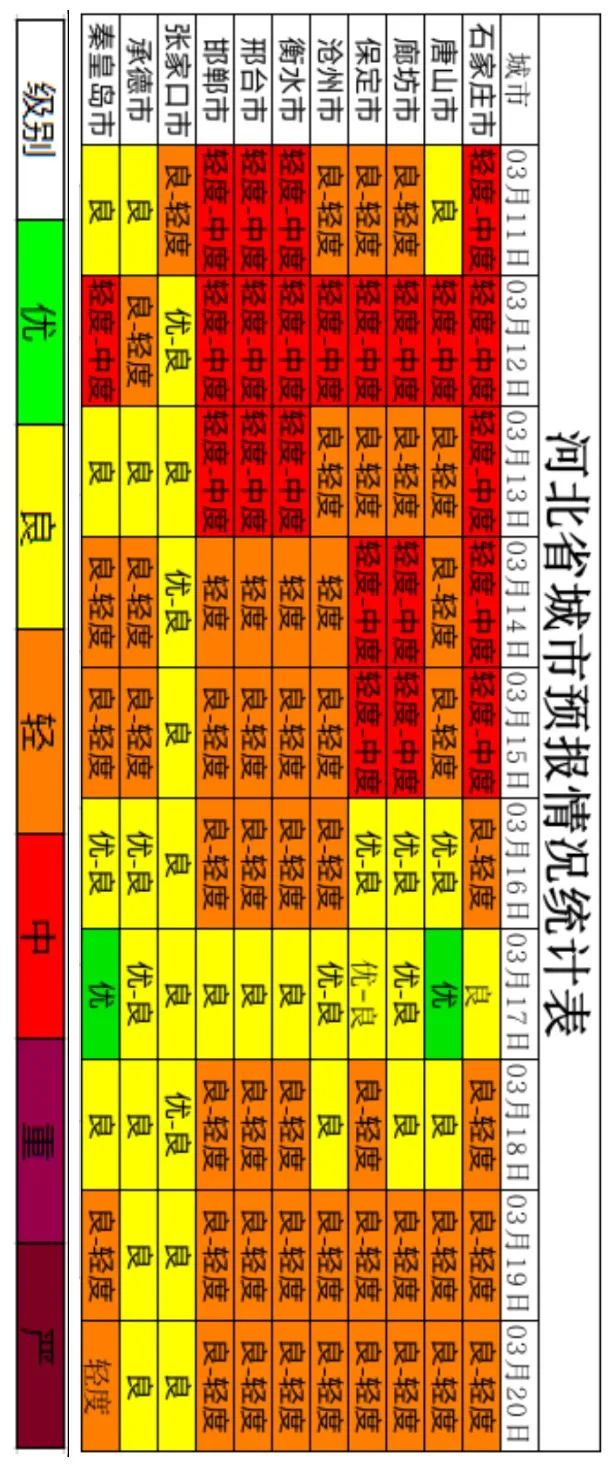 11日,高空转弱脊区,我省东部有弱高压影响,中西部仍为低压控制。张家口受东南方向污染输送影响,空气质量以良至轻度污染为主;承德、秦皇岛、唐山受东北风影响,湿度降低,污染改善,空气质量以良为主;廊坊、保定、沧州受偏东北风影响较早,空气质量以良至轻度污染为主;石家庄、衡水、邢台、邯郸前期受南北风辐合影响,污染改善偏晚,空气质量以轻至中度污染为主。