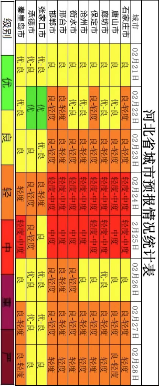 经河北省生态环境应急与重污染天气预警中心与中国环境监测总站和省环境气象中心联合会商,预计2022年2月下旬(21~28日),前期和后期,地面受北风影响,温度下降,湿度偏低,整体扩散条件较好,我省北部空气质量以优良为主,东部和中南部空气质量以良至轻度污染为主;23-25日,高空受脊区控制,中层持续升温,地面转为南风,风力转弱、湿度升高,大气扩散条件转差,我省东部和中南部可能出现一次轻度至中度污染过程,其中个别城市可能达到短时重度污染水平;26日起,受较强西北冷空气影响,大气扩散条件转好,污染逐步清除。