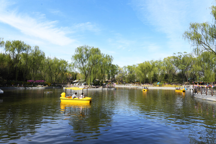2021年4月3日,游客在北京南宫五洲植物乐园划船。新华社记者任超摄