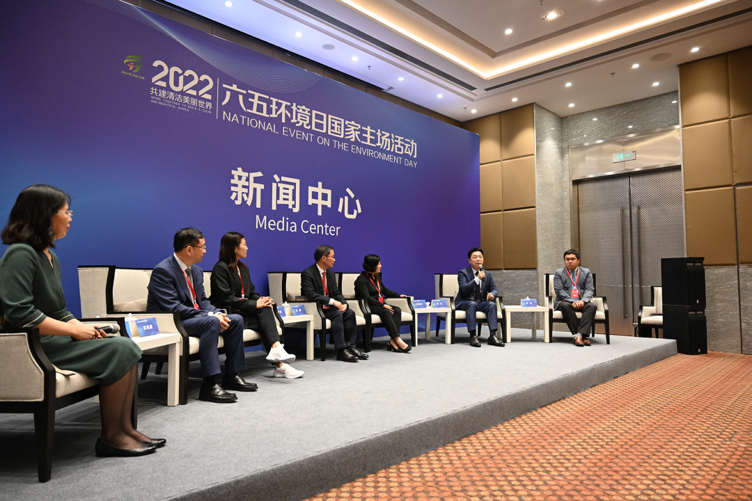 2022年六五环境日国家主场活动首次设立杏彩。会议期间,举办了2022年度生态环境特邀观察员、生态文学作家及“美丽中国,我是行动者”提升公民生态文明意识行动计划先进典型代表等三场集体采访。图为特邀观察员集体采访活动现场