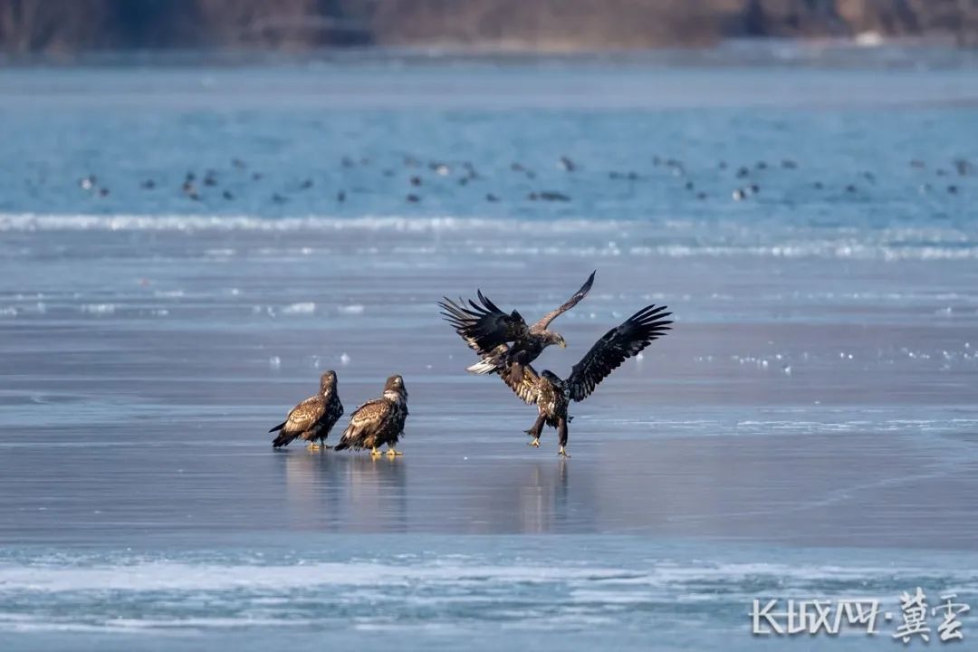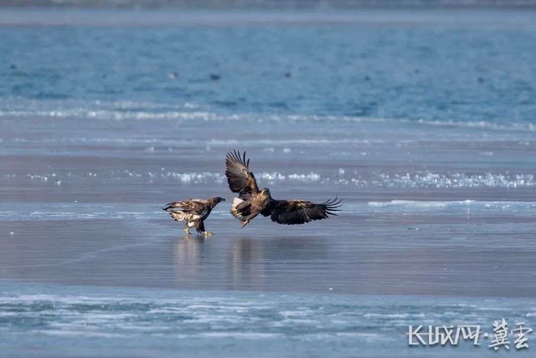 石家庄摄影爱好者在岗南水库拍摄到白尾海雕觅食栖息的画面。