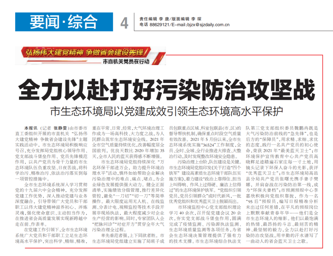 1月7日,《石家庄日报》四版刊发《全力以赴打好污染防治攻坚战 市生态环境局以党建成效引领生态环境高水平保护》。