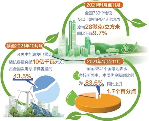 绿色制造步伐加快。2021年前三季度,单位GDP能耗同比下降2.3%,规模以上工业单位增加值能耗下降5.2%。绿色低碳产品供给增强,2021年1月至11月新能源汽车累计产销量同比增长1.7倍。生产生活方式逐步有序向全面绿色低碳转型。
