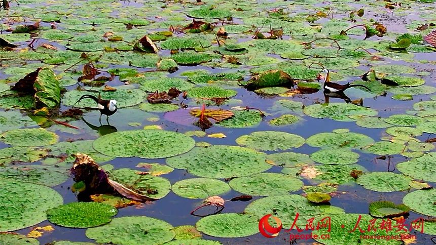 图为水雉立于芡实叶之上。高腾摄