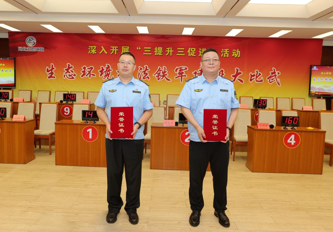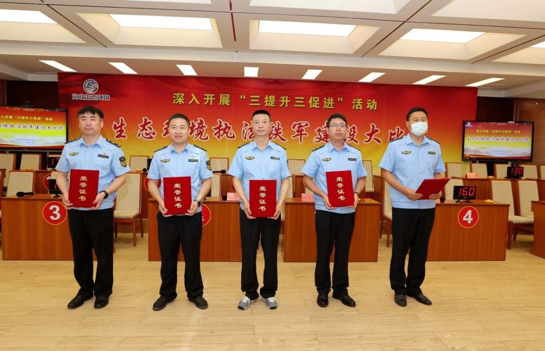 经过激烈角逐,比武共评选出集体一等奖1个(石家庄市生态环境执法代表队)、二等奖2个(张家口、辛集市生态环境执法代表队)、三等奖3个(唐山、邯郸、承德市生态环境执法代表队)、纪念奖5个(定州、邢台、秦皇岛、沧州、保定市生态环境执法代表队)。厅领导分别为获奖代表队颁发荣誉证书并合影留念,大比武取得圆满成功。