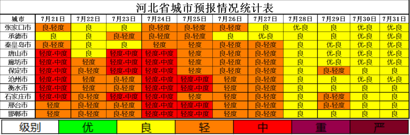 经河北省生态环境应急与重污染天气预警中心与中国环境监测总站、省气象灾害防御和环境气象中心联合会商,预计2022年7月下旬(21日~31日),期间21日~25日,我省大部地区以晴朗少云天气为主,地面受偏南风控制,气温升高,部分城市最高温度可达35℃,可能出现臭氧轻至中度污染过程。