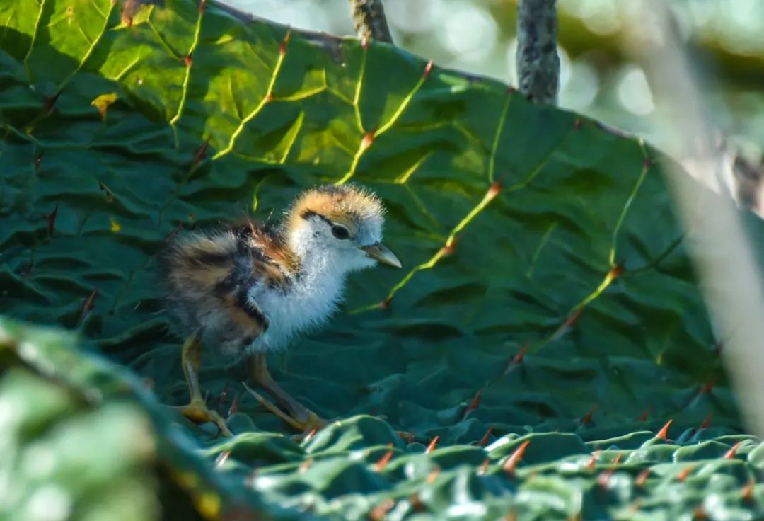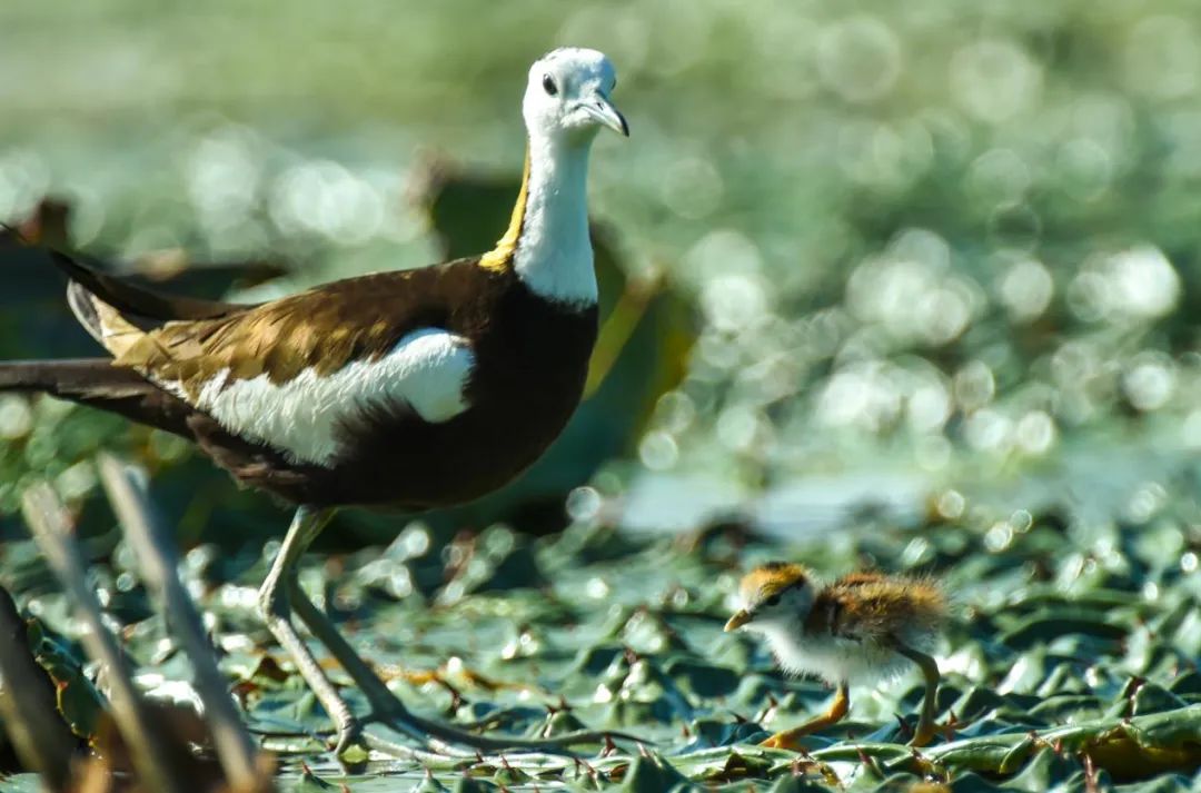 白洋淀水域,水雉守护在刚刚破壳而出的水雉雏鸟身边。河北日报记者李东宇摄