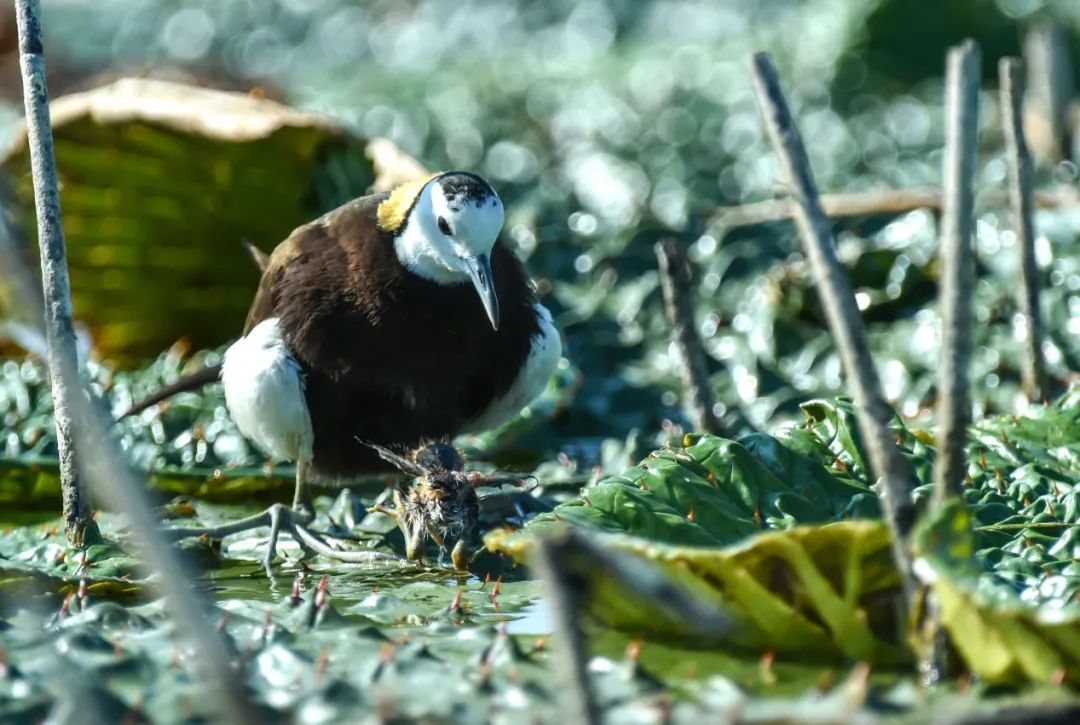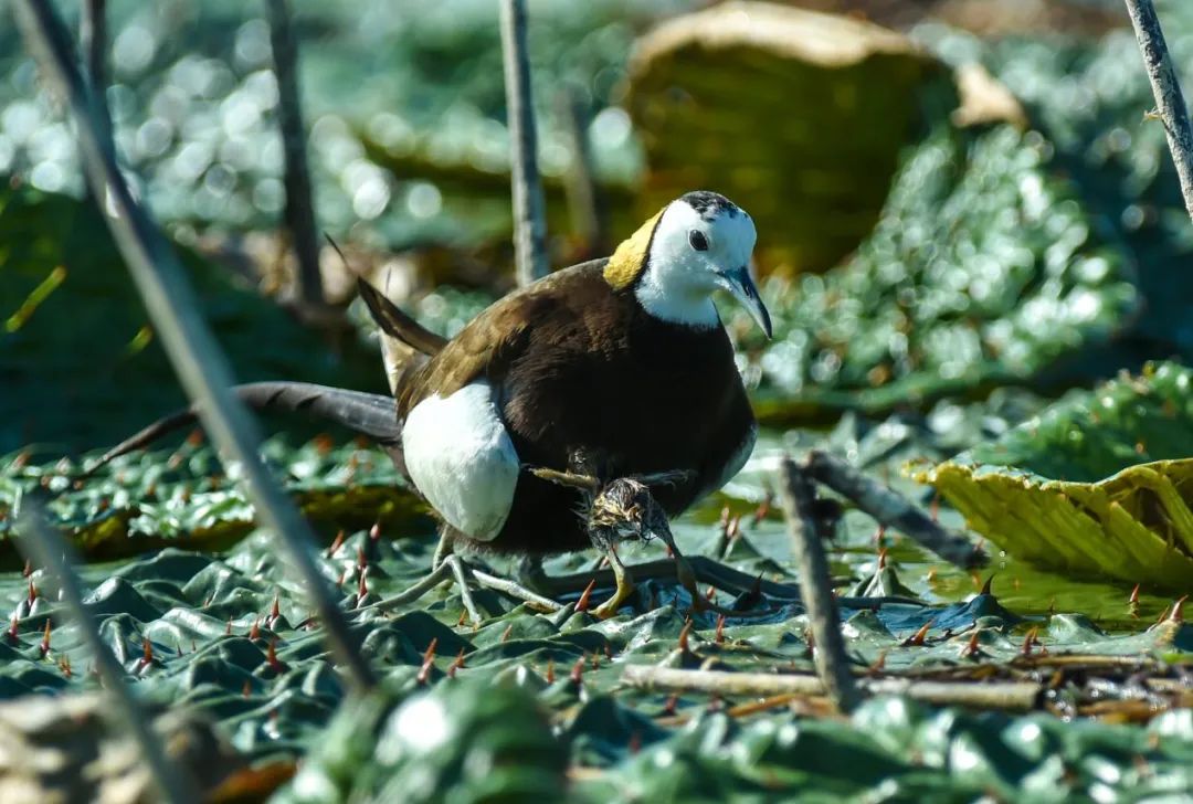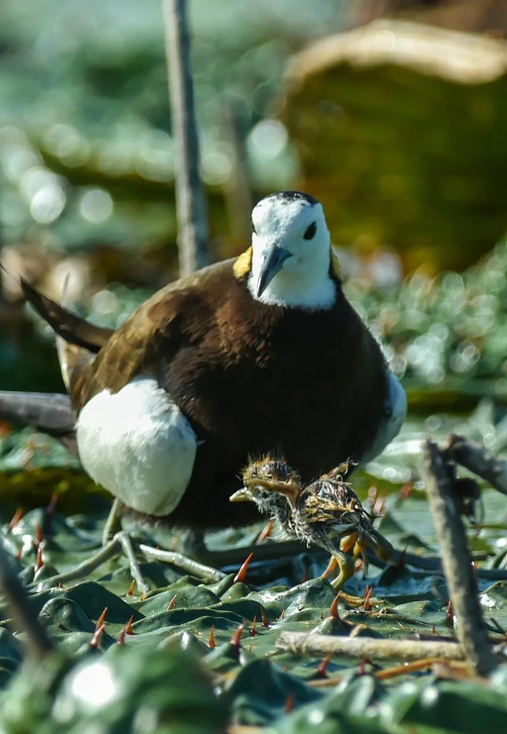 白洋淀水域,水雉将刚刚破壳而出的水雉幼崽护在羽翼下。河北日报记者李东宇摄