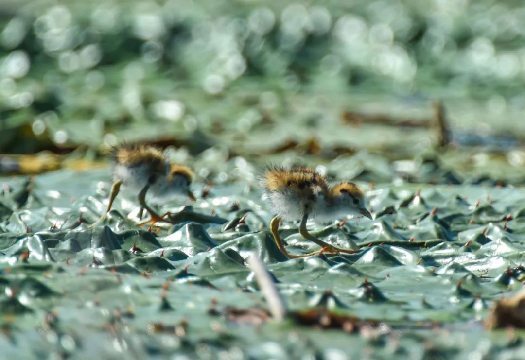 白洋淀水域,两只水雉雏鸟在芡实上觅食。河北日报记者李东宇摄
