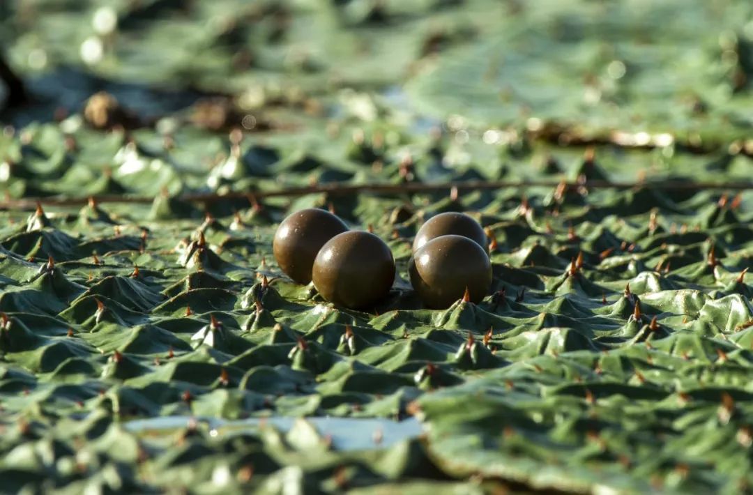 2022年7月20日,白洋淀水域,四枚水雉蛋在芡实上。河北日报记者李东宇摄