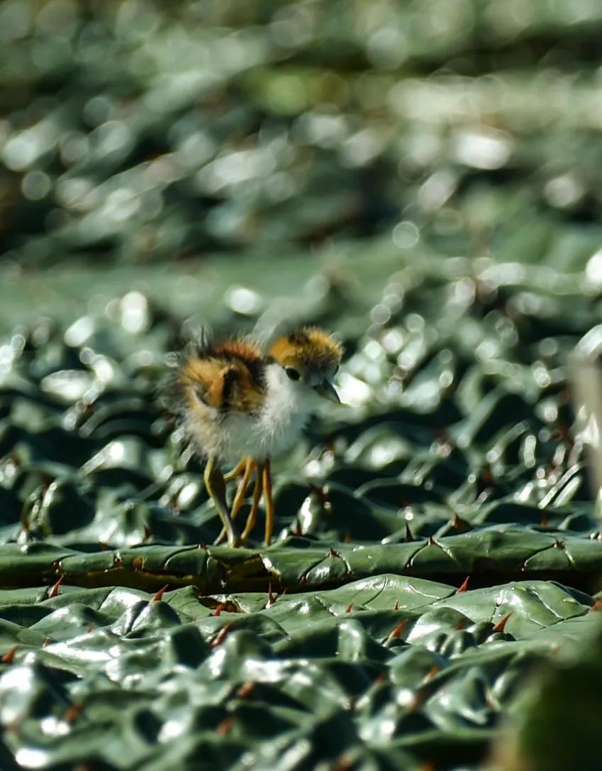 白洋淀水域,一只水雉雏鸟在芡实上休息。河北日报记者李东宇摄